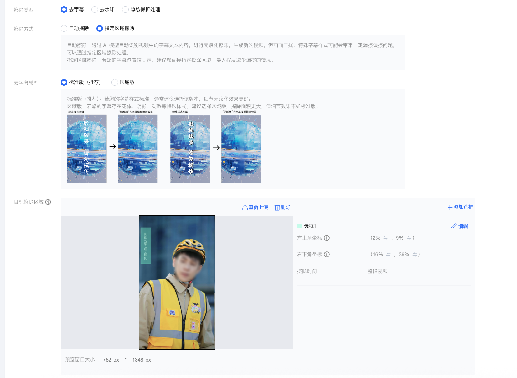 模板配置场景2:调整自动擦除区域,保护无需擦除的视频区域,减少误擦问题