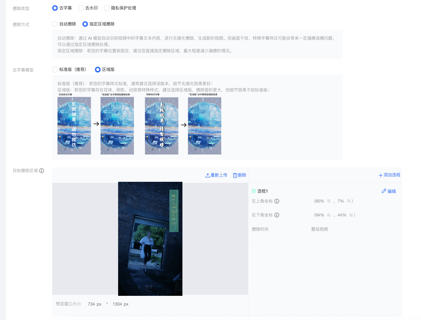 区域版:适用于特殊样式字幕(如背景阴影、花体、动效),擦除面积更大,但无痕效果不如标准版。