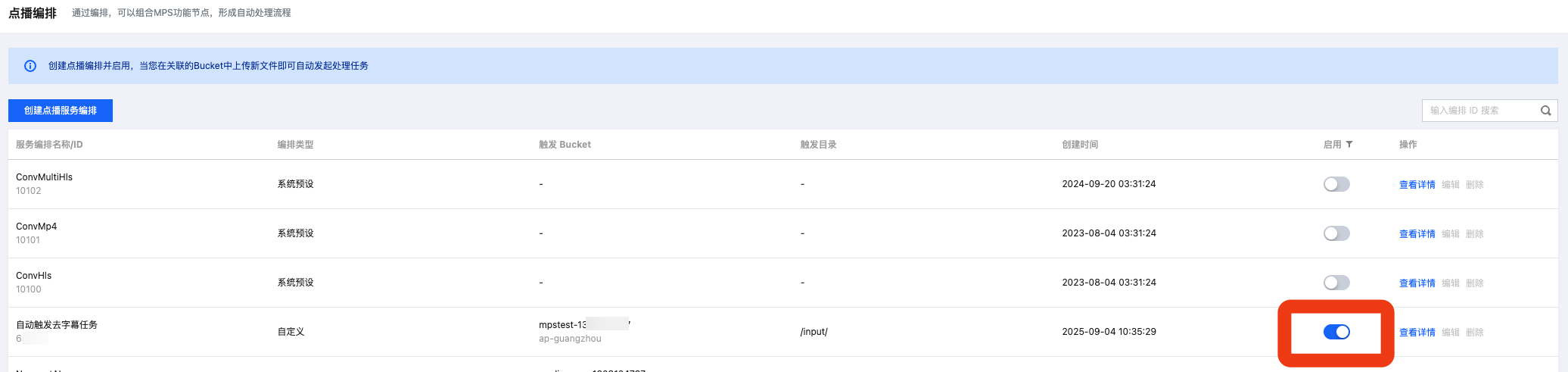 3. 成功创建编排后,进入点播编排列表,启用该编排。后续在触发目录中上传需要处理的视频文件,将自动按照编排中的任务配置处理新上传的视频,无需手动在控制台创建任务。