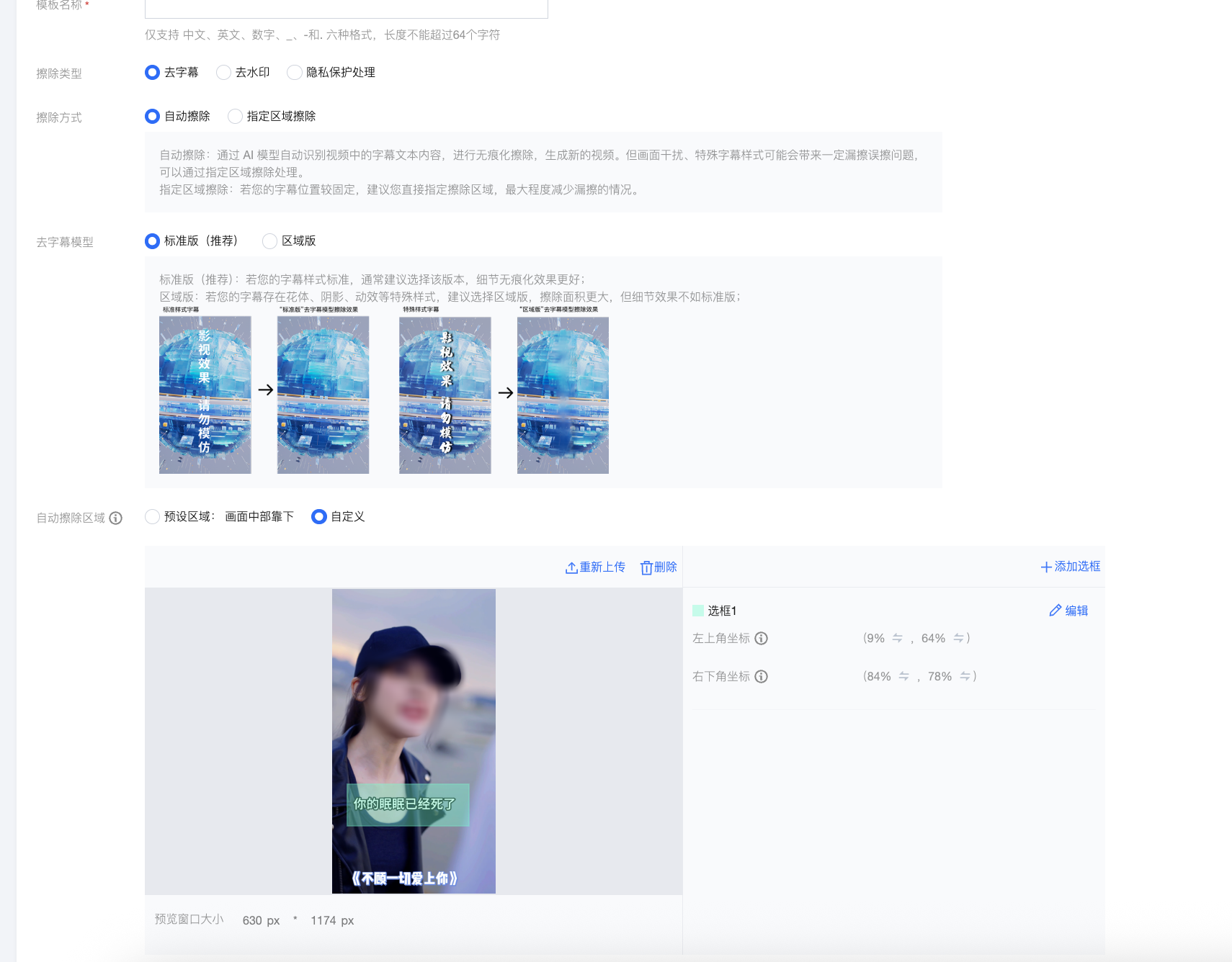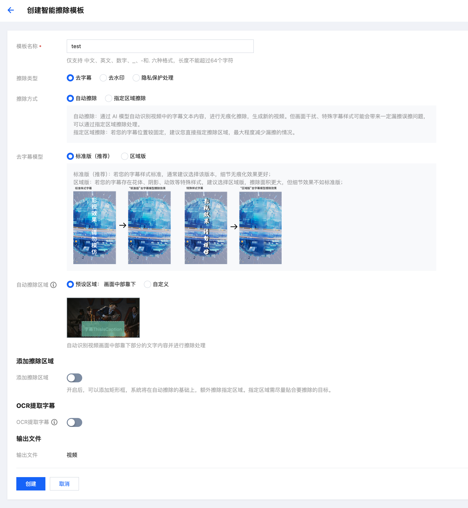 进入控制台智能擦除模板页面,参数说明可参考 智能擦除模板。为方便理解,下文分功能和应用场景给出了模板配置示例。 去字幕
