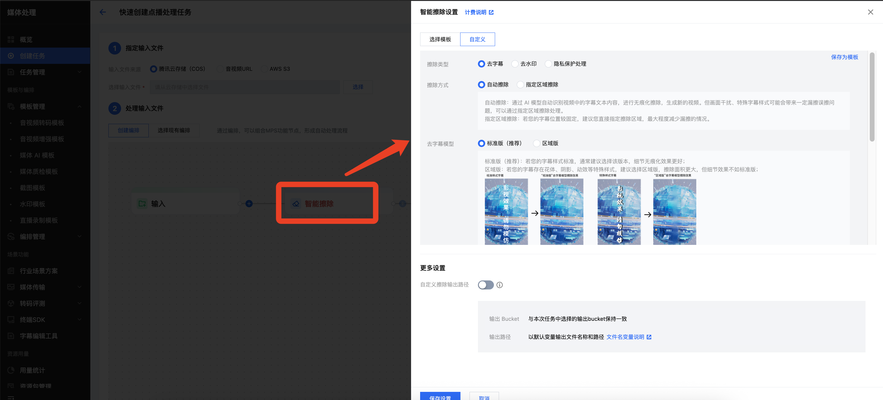在任务处理流程中需要添加智能擦除节点,并选择智能擦除模板或自定义擦除参数。