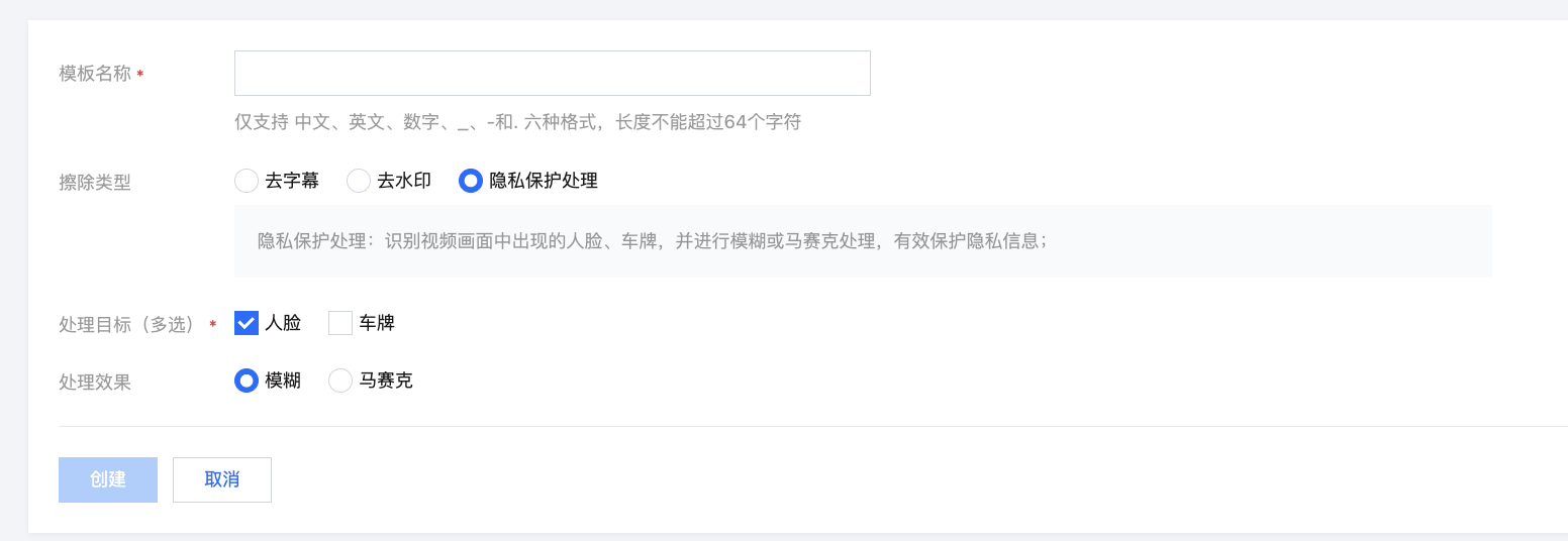 使用隐私保护处理功能,收取“隐私保护处理(人脸、车牌)”费用,定价请参考 智能擦除计费说明。 模板配置示例