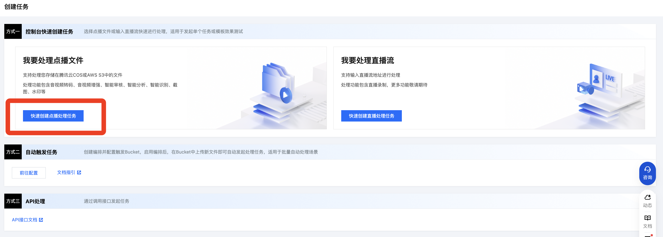 控制台创建任务 | 零代码。每次可手动选择单个视频发起任务,适用于测试阶段。 | 进入控制台创建任务页面,选择输入文件路径、配置处理流程和参数、指定输出路径,即可发起任务。 |