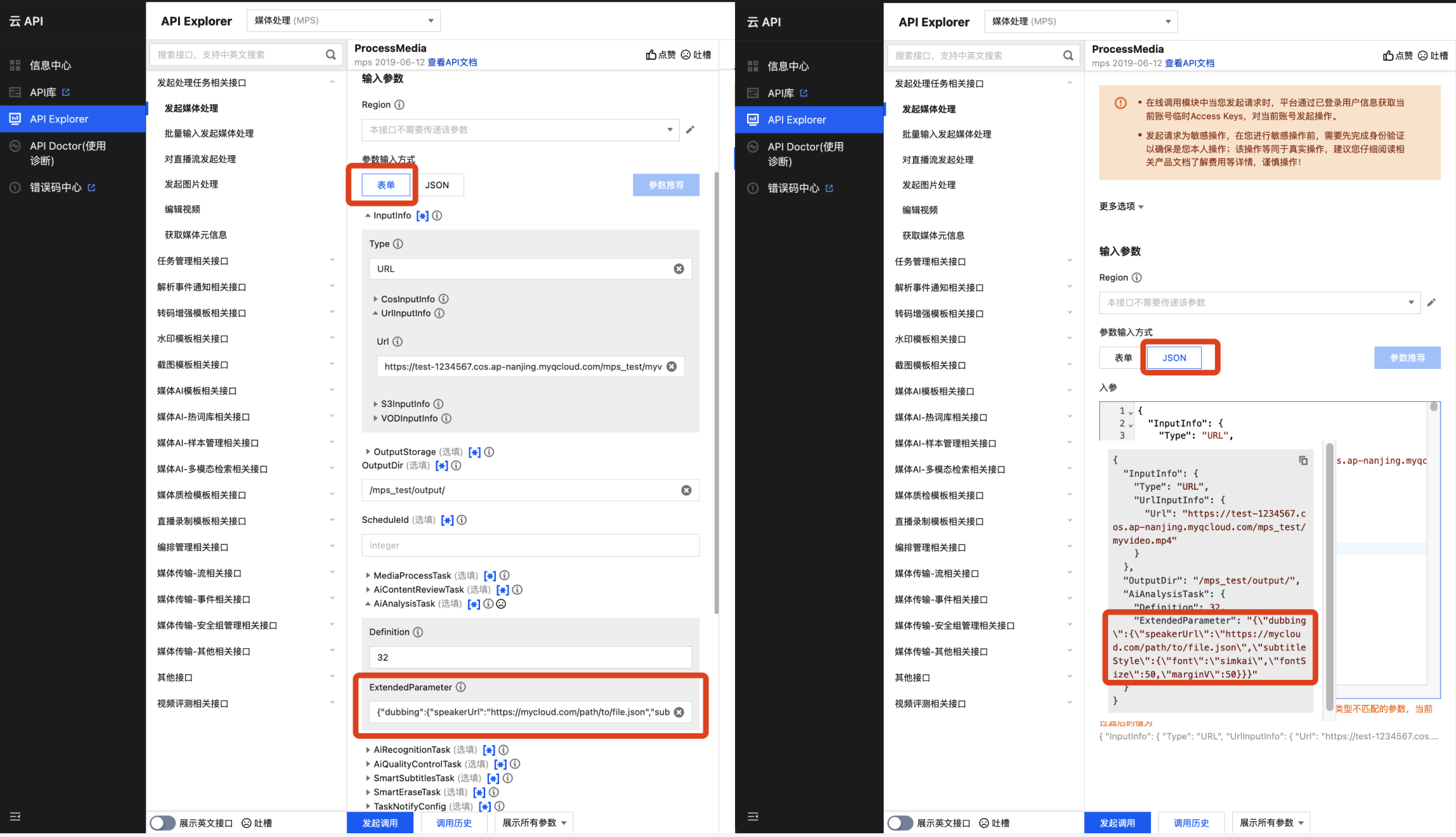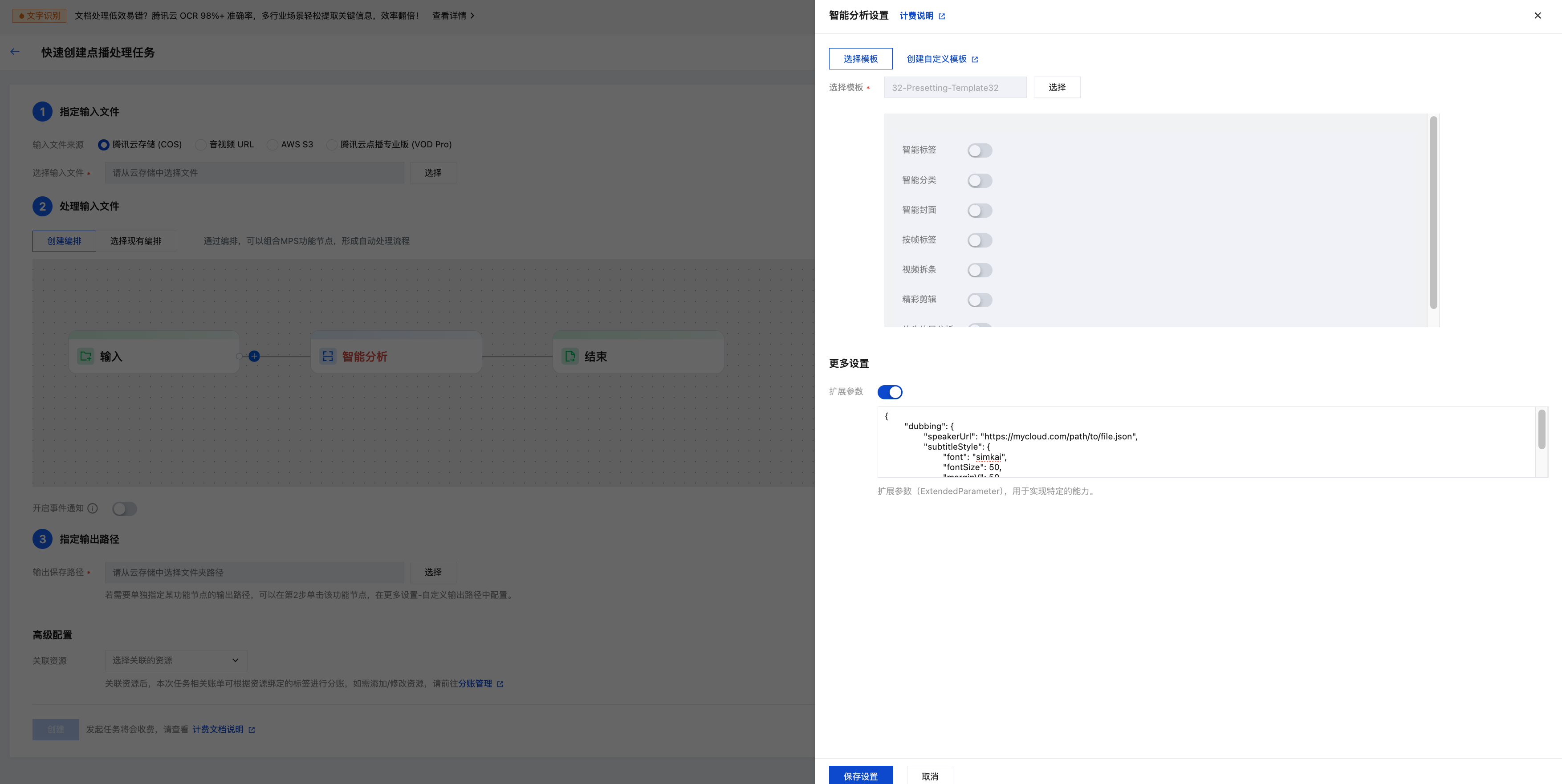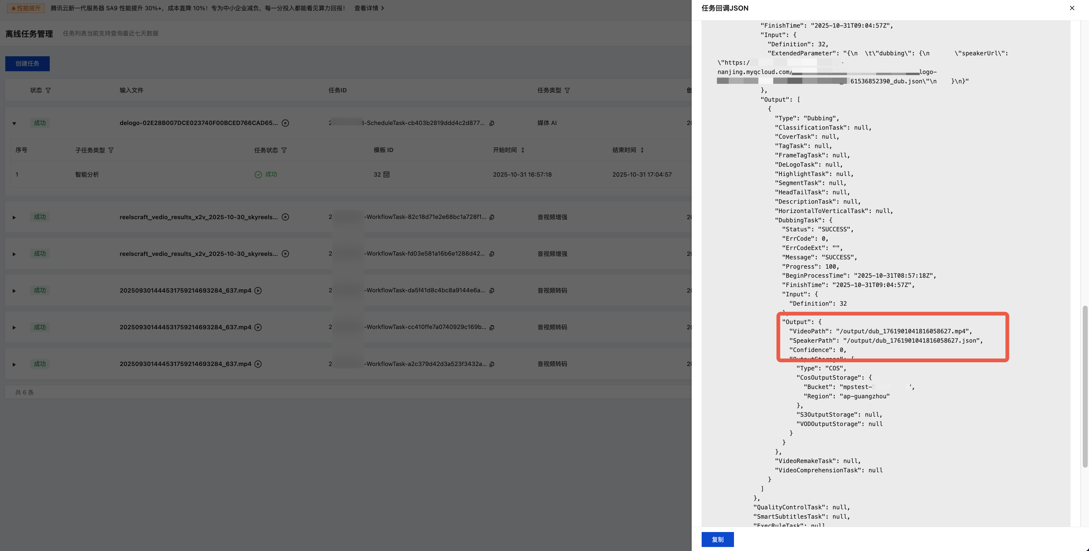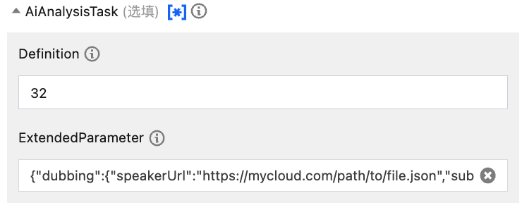 {"InputInfo":{ //输入视频路径,请替换为您的原始视频(建议使用无字幕视频,纯配音服务不会做字幕擦除)"Type":"URL","UrlInputInfo":{"Url":"https://test-1234567.cos.ap-nanjing.myqcloud.com/mps_test/myvideo.mp4"}},"OutputStorage":{ //输出COS存储桶,请替换"Type":"COS","CosOutputStorage":{"Bucket":"test","Region":"ap-nanjing"}},"OutputDir":"/mps_test/output/",//输出文件夹路径,请替换"AiAnalysisTask":{"Definition":32, //预设模板ID,填 32 即可"ExtendedParameter":"{\\"dubbing\\":{\\"speakerUrl\\":\\"https://mycloud.com/path/to/file.json\\"}}" //扩展参数,必传,用于指定speaker文件路径、字幕样式等参数},"TaskNotifyConfig":{ //事件回调通知配置,可选"NotifyType":"URL","NotifyUrl":"http://www.qq.com/callback"}}