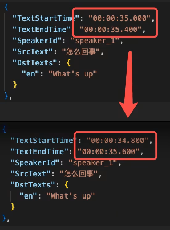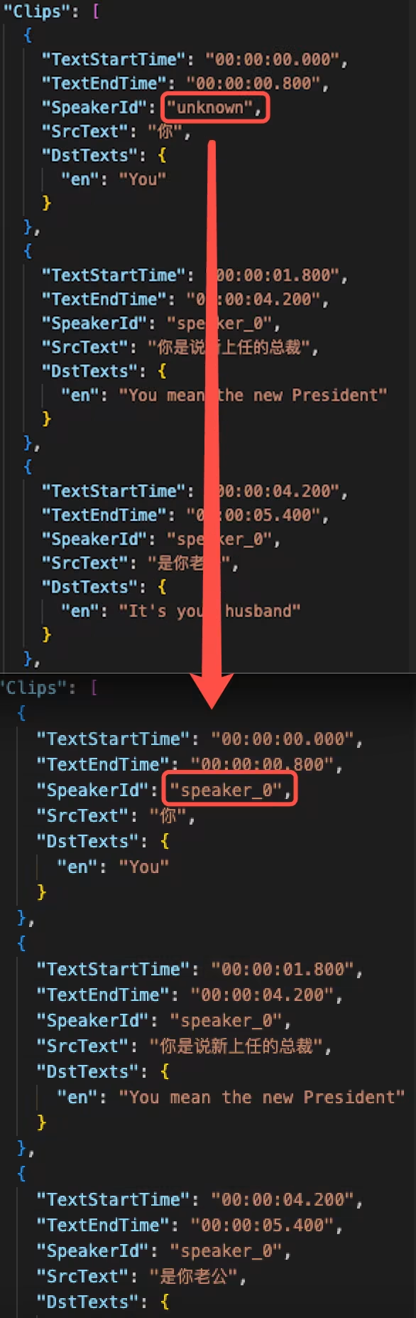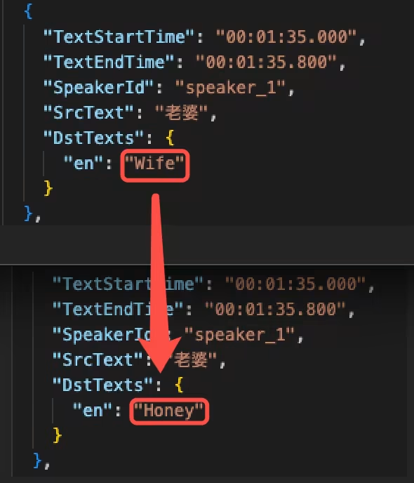 {"SrcLang": "zh","DstLangs": ["en"],"Speakers": [{"Id": "speaker_0","Gender": "male"},{"Id": "speaker_1","Gender": "female"}],"Clips": [{"TextStartTime": "00:00:00.100","TextEndTime": "00:00:00.600","SpeakerId": "speaker_0","SrcText": "没谁","DstTexts": {"en": "No one"}},{"TextStartTime": "00:00:01.0","TextEndTime": "00:00:01.200","SpeakerId": "speaker_1","SrcText": "早上好","DstTexts": {"en": "Morning"}}]}