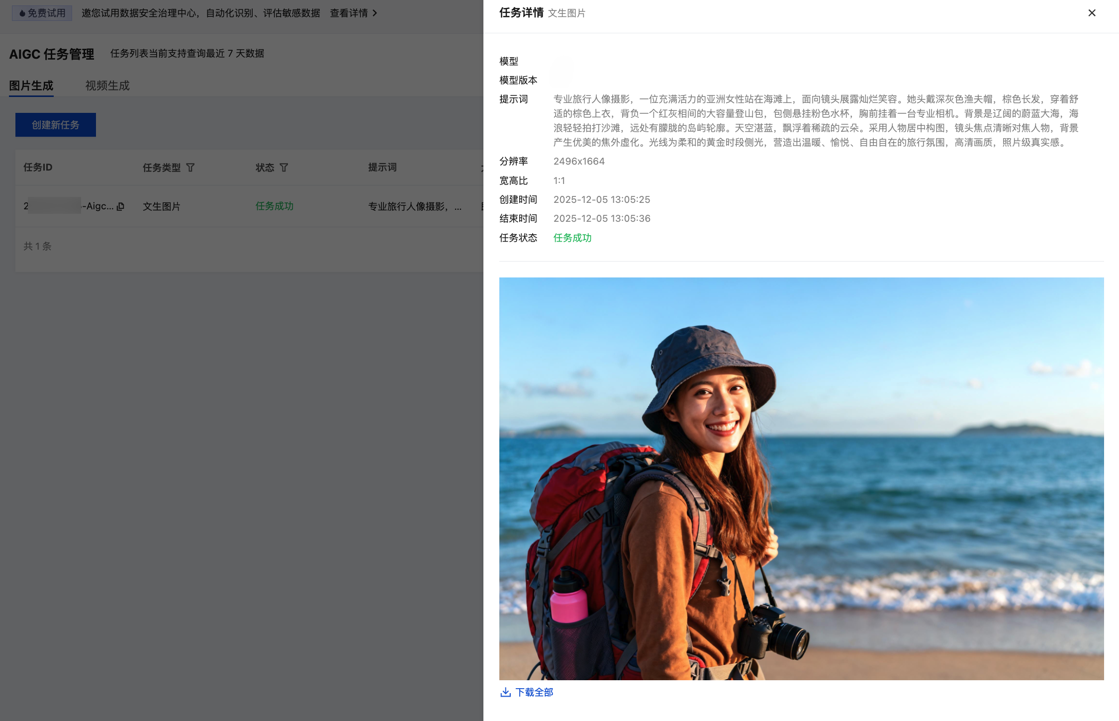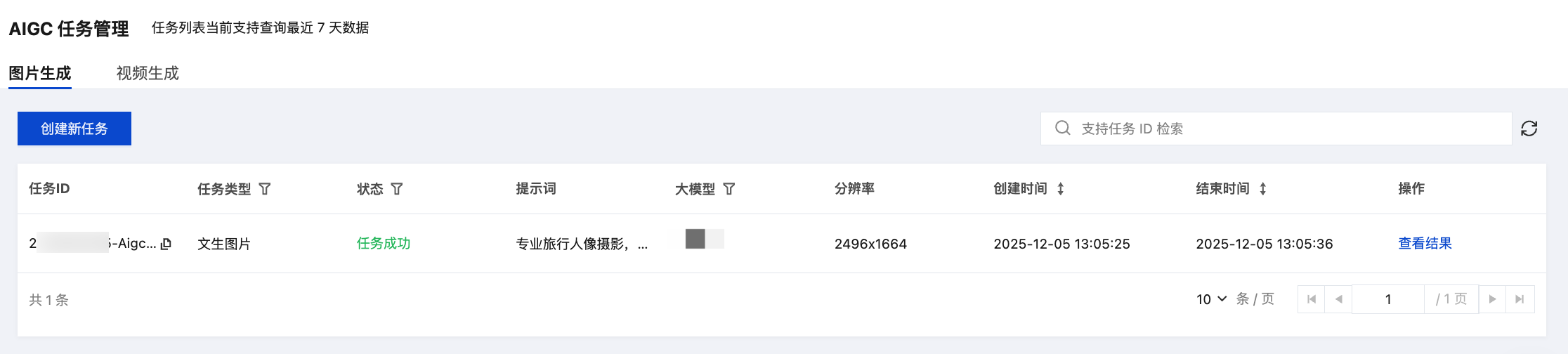 任务类型 | 该任务 ID 对应的任务类型,其中: 图片生成:包含文生图片、图生图片。 视频生成:包含文生视频、图生视频。 |