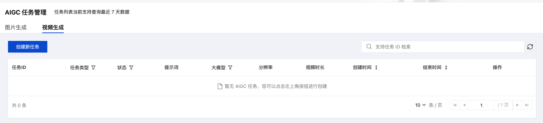 视频时长 | 生成的视频结果的时长(图片任务列表无该字段)。 |