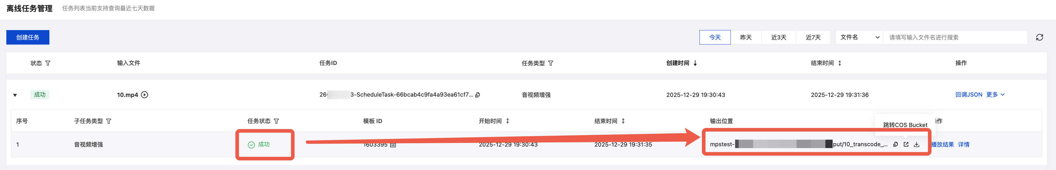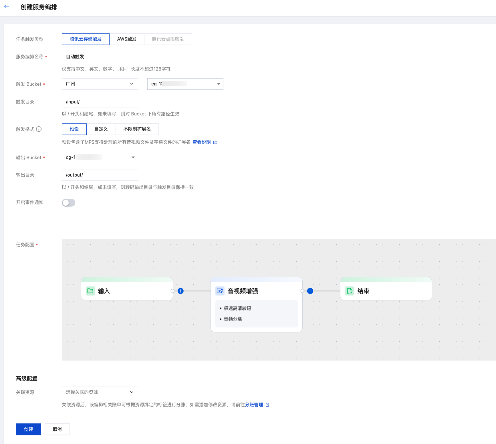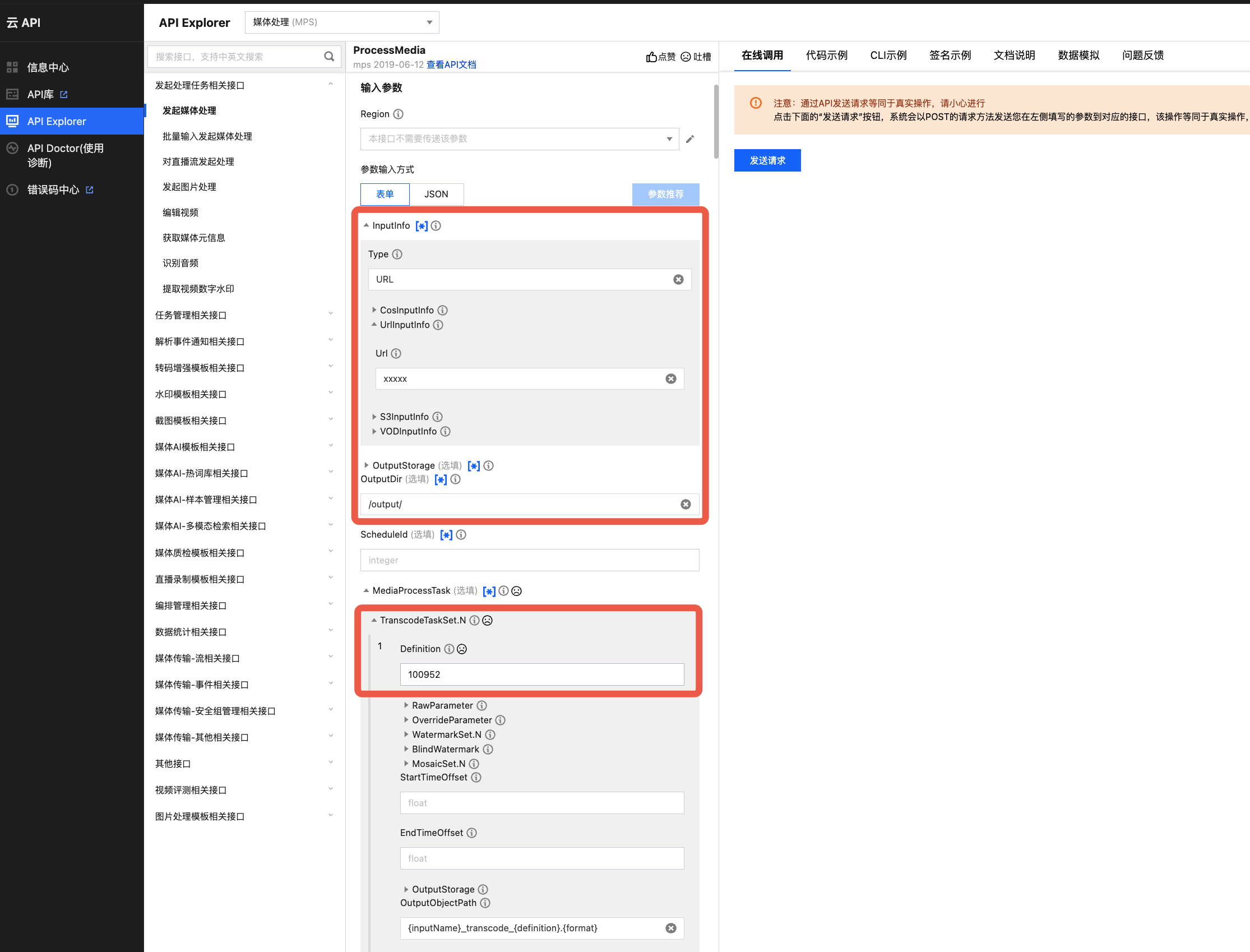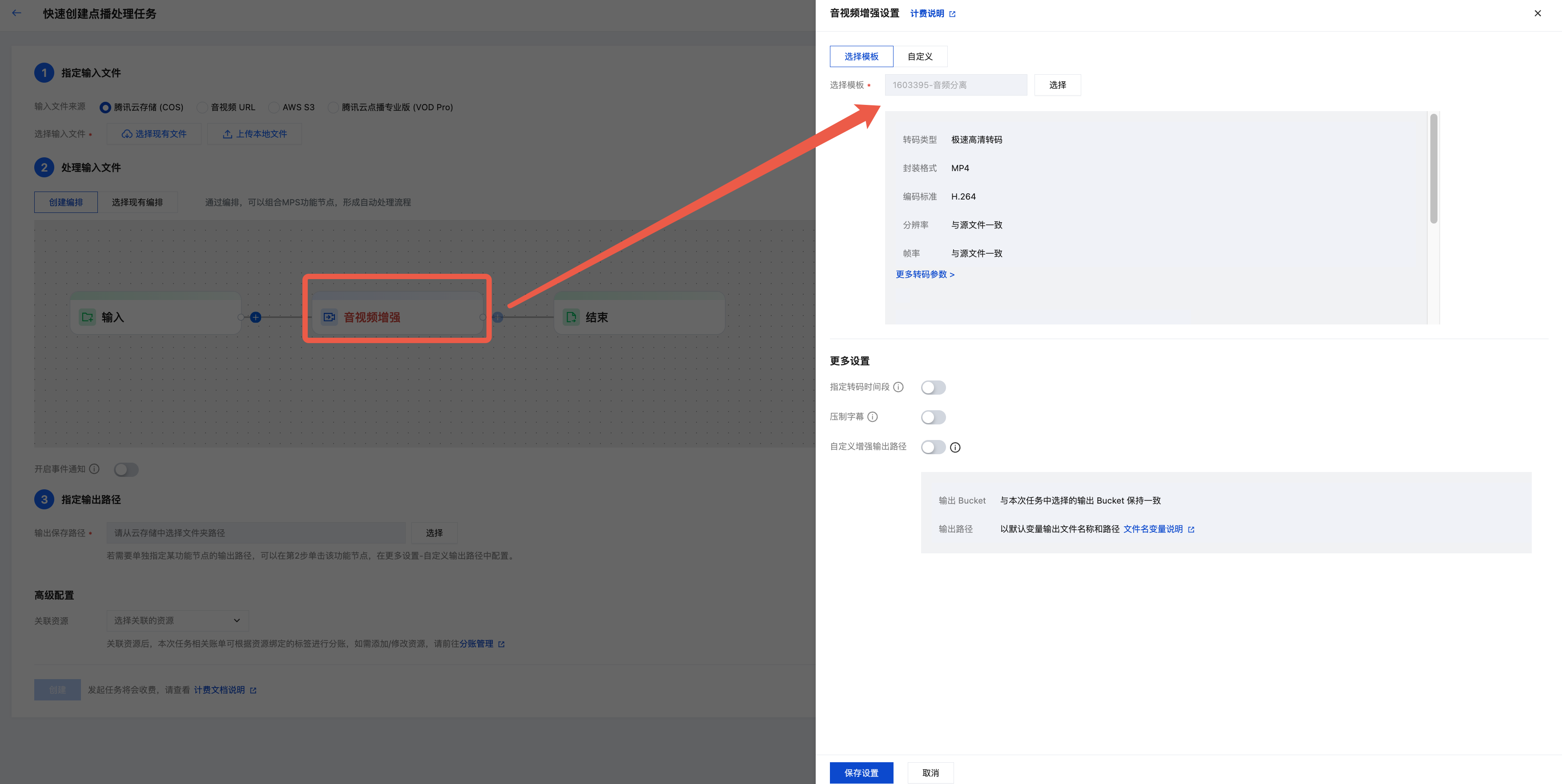 MediaProcessTask -> TranscodeTaskSet -> Definition 传入模板 ID,即可发起任务。示例:{"InputInfo": {//输入文件路径,支持COS、URL等来源"Type": "URL","UrlInputInfo": {"Url": "xxxxx"}},"OutputStorage": {//输出路径,支持COS、VODPro等"Type": "COS","CosOutputStorage": {"Bucket": "xxx",// 例如media-1300111"Region": "xxx" // 例如ap-beijing}},"OutputDir": "/output/","MediaProcessTask": {"TranscodeTaskSet": [{"Definition": 100952,//必传,100952为预设模板ID,请替换为您的自定义音频分离模板ID"OverrideParameter": { // 覆盖参数,覆盖模板中对应参数值,如不需要可以删除"Container": "m4a",// 例如指定输出为m4a"AudioTemplate": {"Codec": "aac","Bitrate": 64,"SampleRate": 44100,"AudioChannel": 2}},"OutputObjectPath": "{inputName}_transcode_{definition}.{format}" // 指定文件输出名,可选}]},"TaskNotifyConfig": {"NotifyType": "URL","NotifyUrl": "xxx" // 回调,可选}}