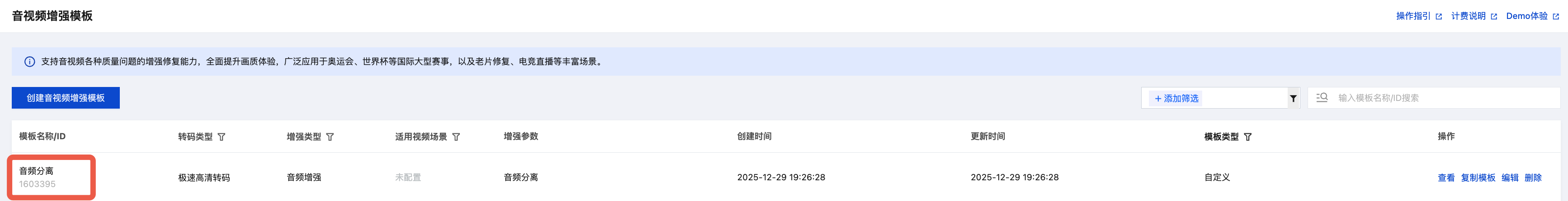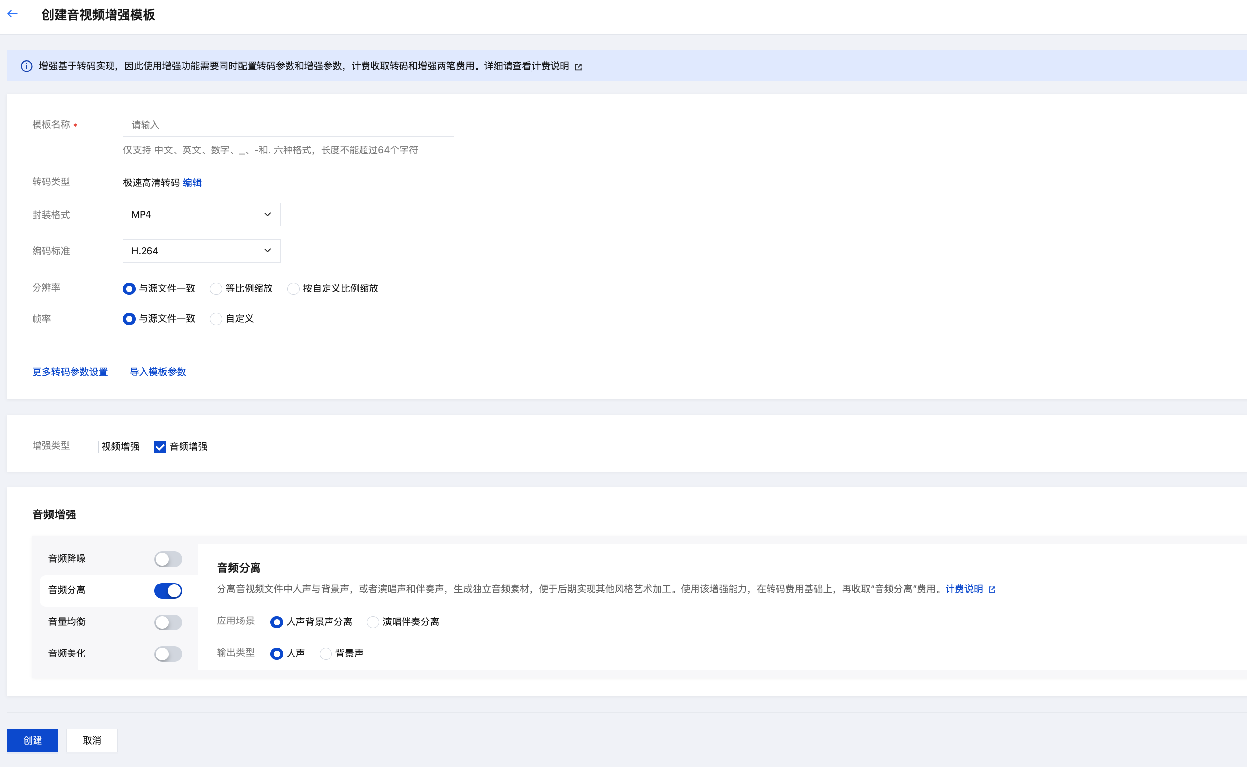 音乐分离/去音乐 | 将音视频文件中的“音乐”部分去除,保留其他音频内容如人声对话、环境音、效果声等。 | 视频出海去除无版权音乐 替换视频音乐 | 内测中,暂收取“音频分离”费用。 该功能计划于2026年第一季度正式上线。届时可能调整计费方式及价格,如有变动我们将通过站内信、短信或网站公告等方式通知您。感谢您的支持。 | |