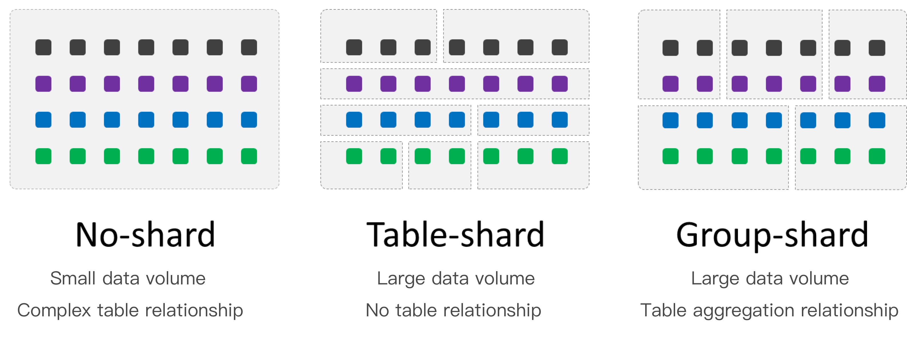 分表键是在水平拆分过程中用于生成拆分规则的数据表字段,必须在建表时指定好。TDSQL MySQL版 建议分表键尽可能找到数据表中的数据在业务逻辑上的主体,并确定大部分(或核心的)数据库操作都围绕这个主体的数据进行,方可使用该主体对应的字段作为拆分键,进行分表(该分表方案名为 Group-Shard)。如下图所示: