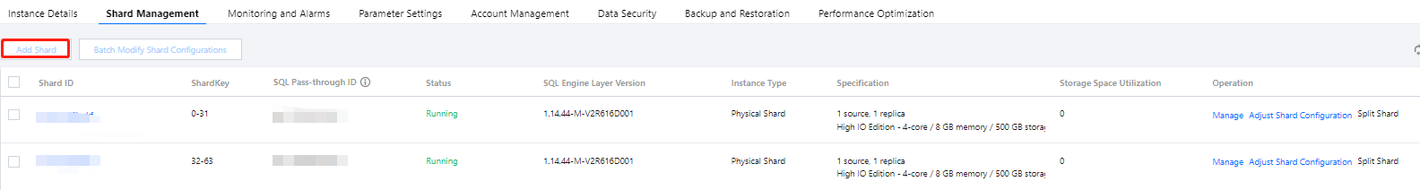 进入实例管理页面,选择分片管理页,在操作列单击调整分片配置进行调整。
