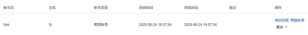 5. 返回账号列表,单击修改权限可以修改用户权限,单击克隆账号可以完全复制当前账号权限来新建一个账号,单击更多可以重置密码和删除账号。