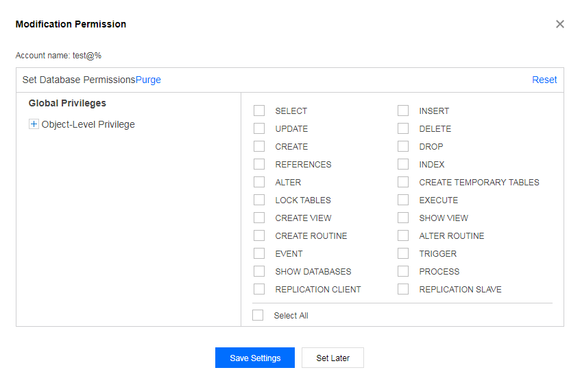 4. 进入修改权限对话框,根据需求分配权限后,单击确定修改即可完成权限分配。若需稍后设置权限,单击取消修改即可。 左边导航栏提供完全兼容 MySQL 管理方式的图形化界面,权限管理可以细化到列级。