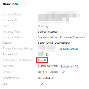1. 登录 TDSQL MySQL 版控制台,在实例列表,单击实例 ID,进入实例详情页,在基本信息的外网地址处,单击开启