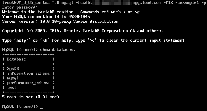 3. 输入命令 mysql -h内外网地址 -P端口 -u用户名 -p 连接 TDSQL MySQL 版,下一步即可进行分表操作。 下图以show databases;为例。