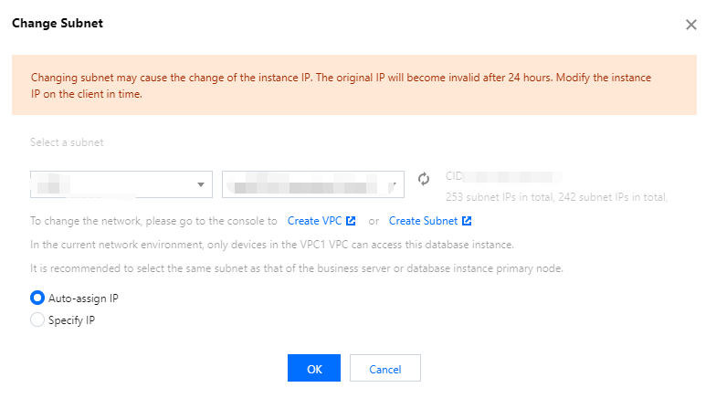 当业务需要修改数据库实例访问地址或者更换私有网络时,可使用通过网络修改功能来调整网络。
