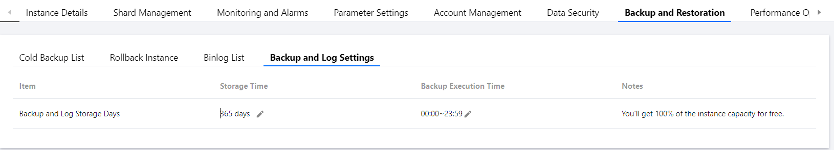 3. 在备份与恢复 > 备份和日志设置页,可设置存储时间和备份执行时间。
