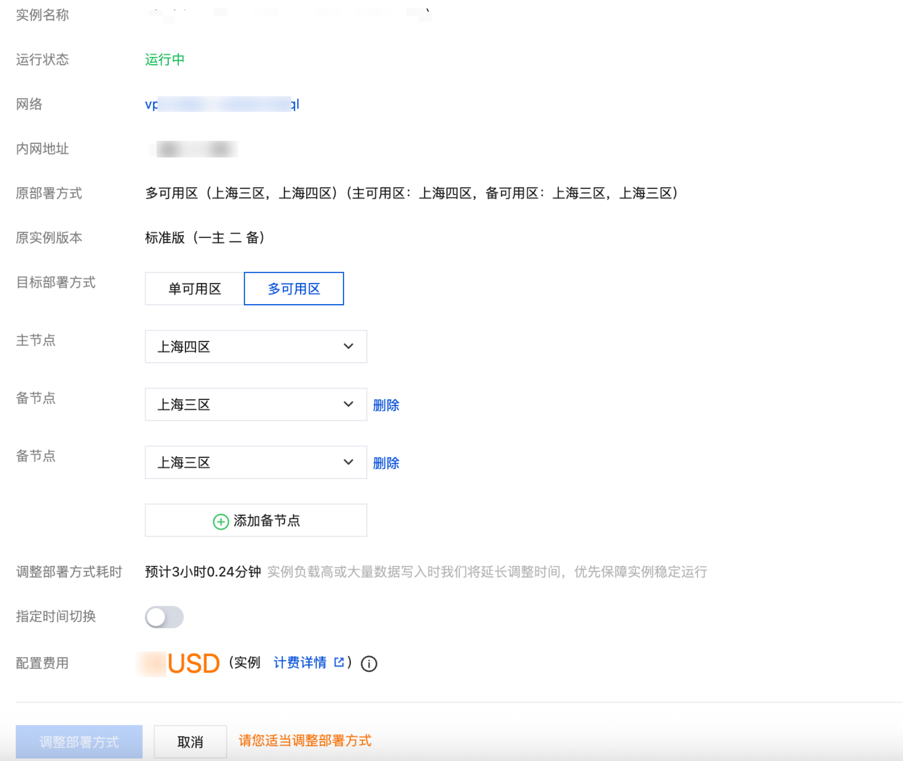 3. 在调整部署方式的页面中,选择目标部署方式,下拉选择主节点和从节点的地区。