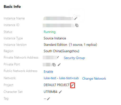 ,在实例列表,单击实例名进入实例详情页,单击所属项目后的