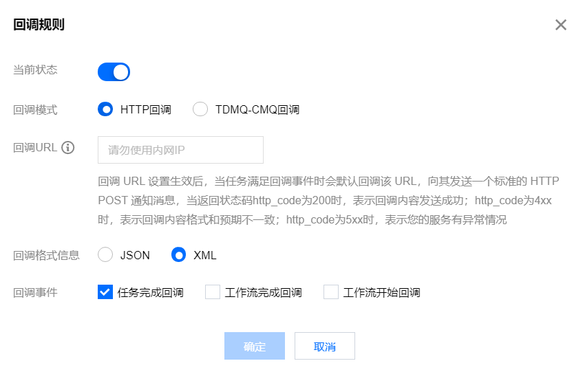 6. 开启回调需设置指定 URL,用于系统发送 HTTP 请求,或选择 TDMQ-CMQ 消息队列。回调详情请查看回调内容。