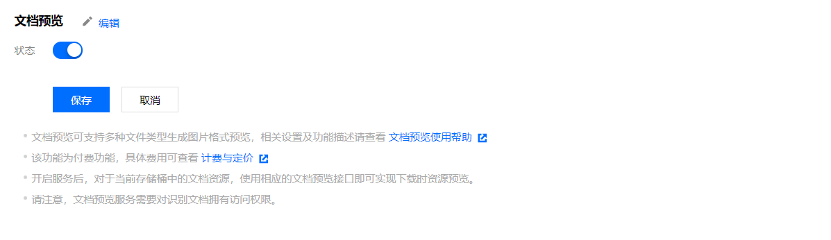 4. 单击文档预览编辑,将状态修改为开启,单击保存,即可开通文档预览服务。
