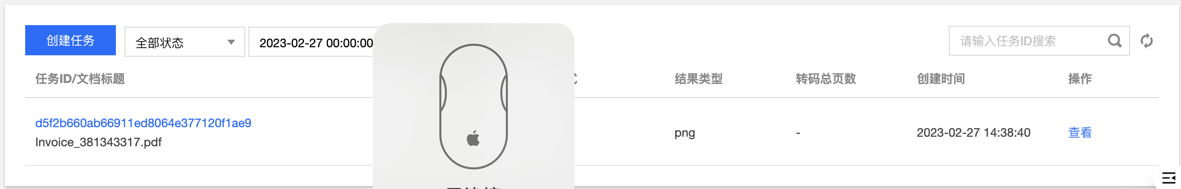 您可在任务管理版块筛选查看文档预览任务。您可按照时间、任务 ID、任务状态进行任务筛选。除页面展示的信息外,单击操作栏查看,可查看更多任务信息。
