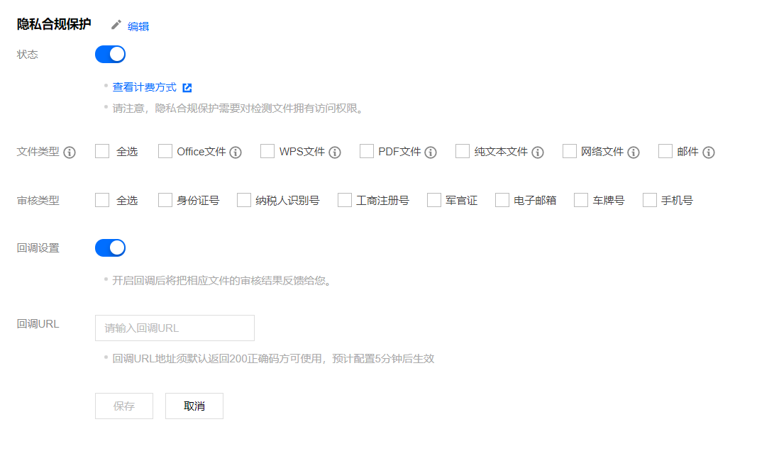 文件类型:支持自动触发隐私合规保护的文件类型,可多选。