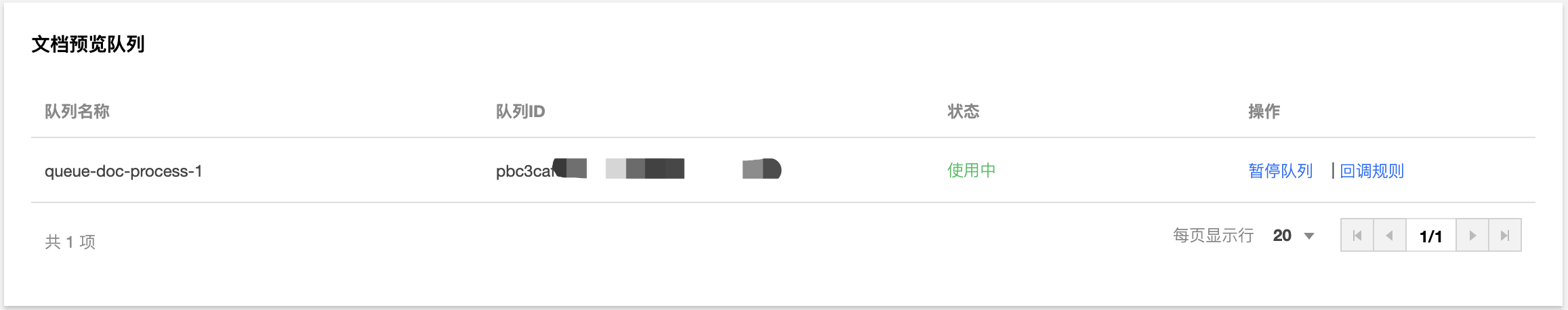 当您开通文档预览服务时,系统默认为您开启 queue-doc-process-1 队列,您可在队列模块操作栏暂停队列。