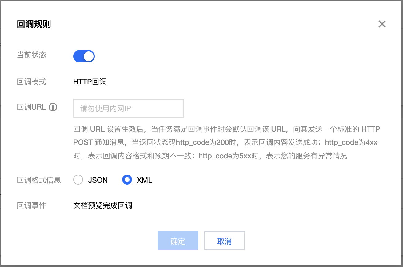 3. 单击编辑,开启回调状态,输入回调 URL 地址,单击确认,完成回调设置。文档预览任务完成后会发送任务的执行情况至回调地址,便于您进行后续操作。