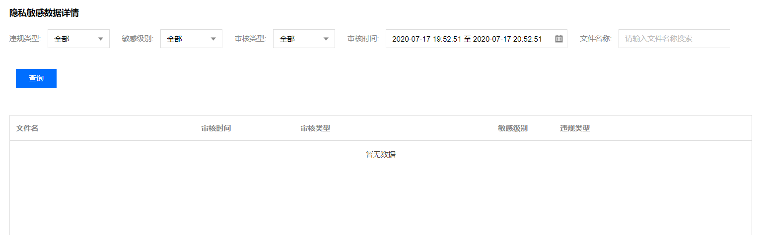 5. 开启隐私合规处理后,您可在页面下方查看隐私敏感数据详情。您可选择查看指定时间、指定违规类型、指定敏感级别、指定审核类型的审核结果。