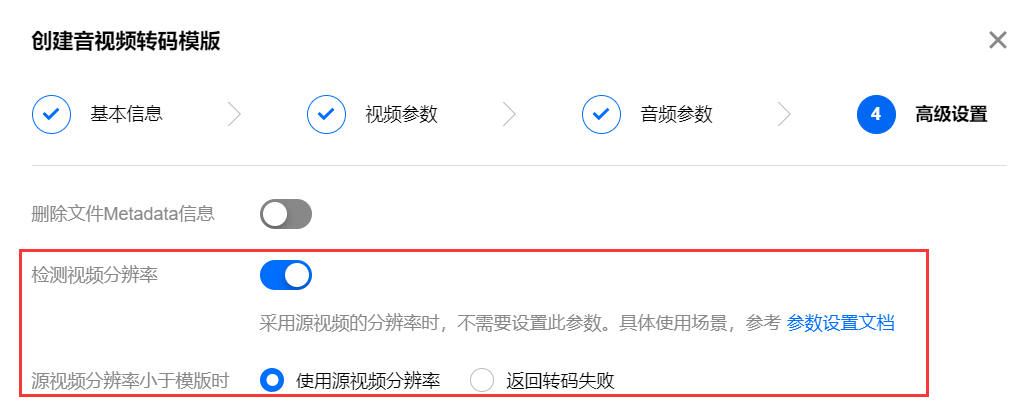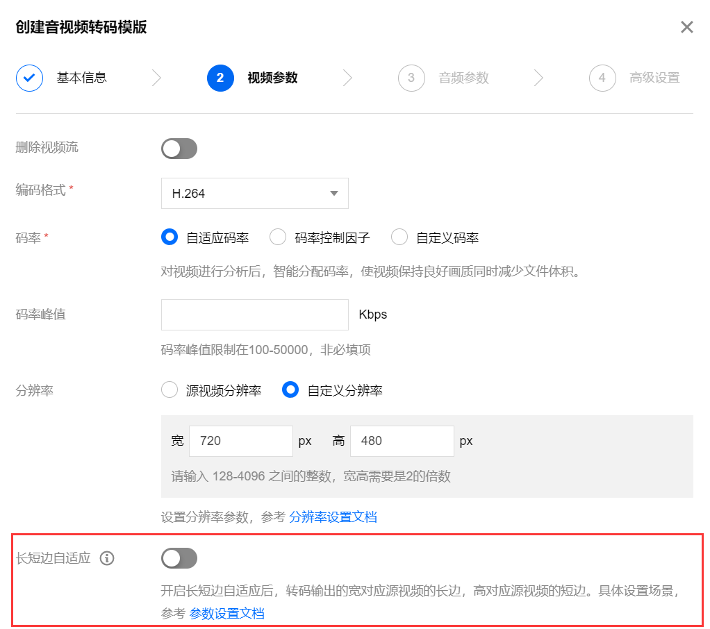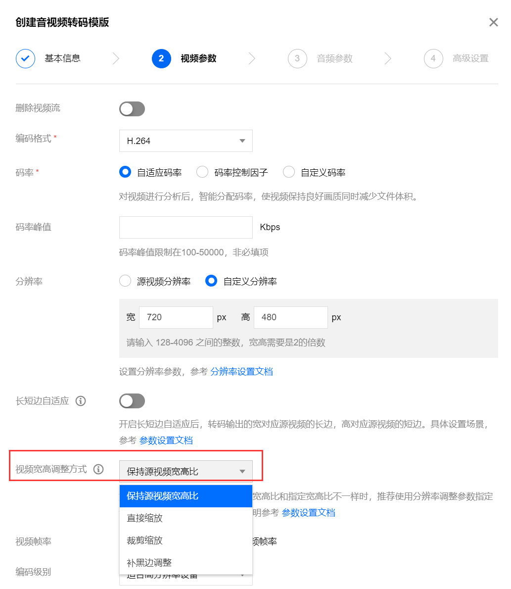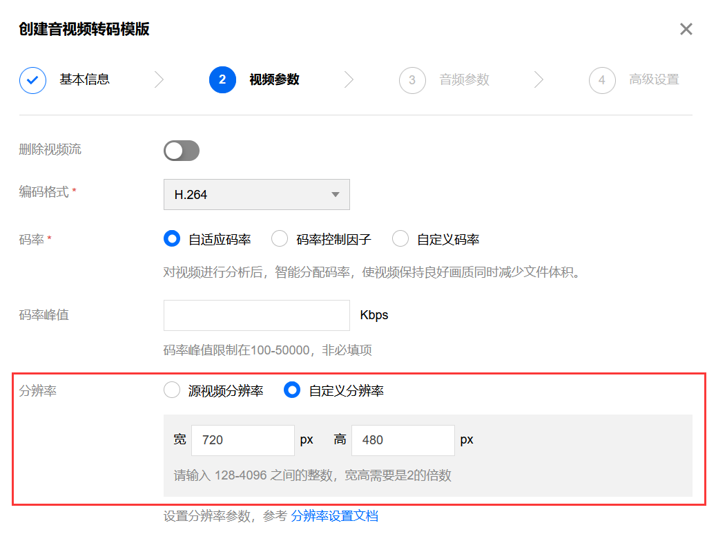 步骤四可选:仅当指定分辨率的宽和高都不为空时(按指定的宽和高进行转码),才需要此步骤。