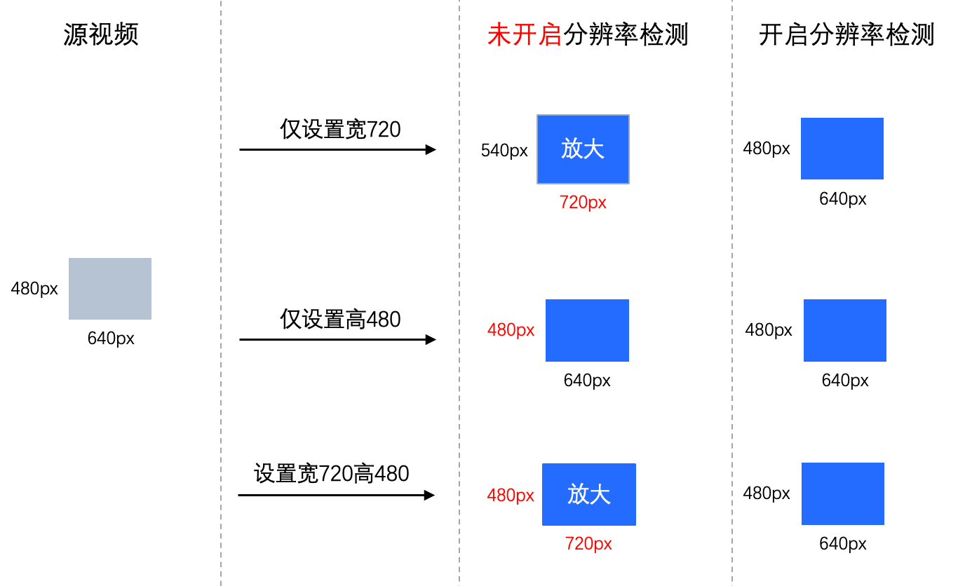 如果输入视频的尺寸不一,转码处理时只想把大尺寸视频变小,不想把小尺寸视频放大,建议开启检测。检测参数说明如下: