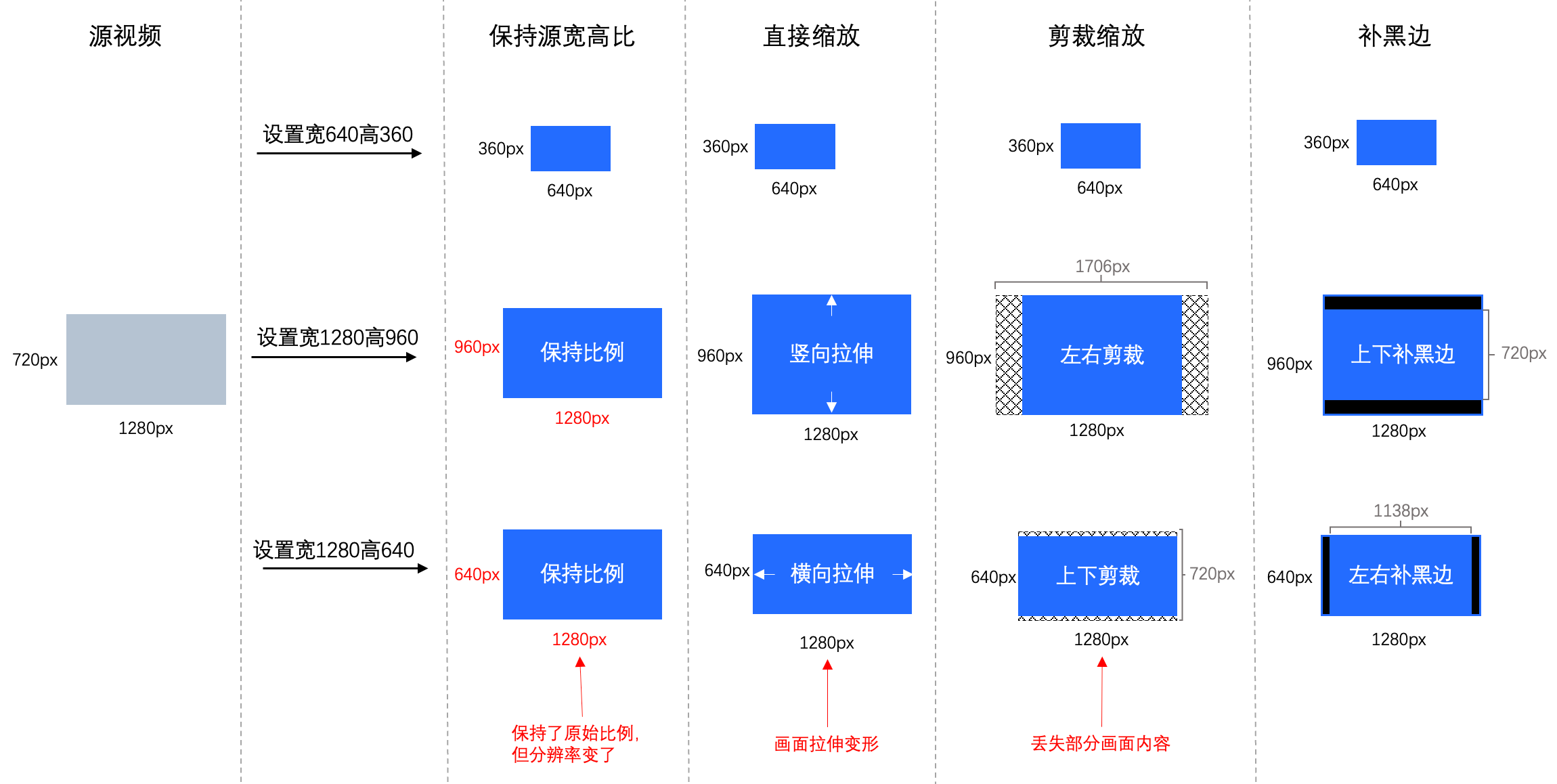 分辨率调整方式支持保留原始比例、缩放、裁剪缩放、补黑边四种,其设置效果如下: