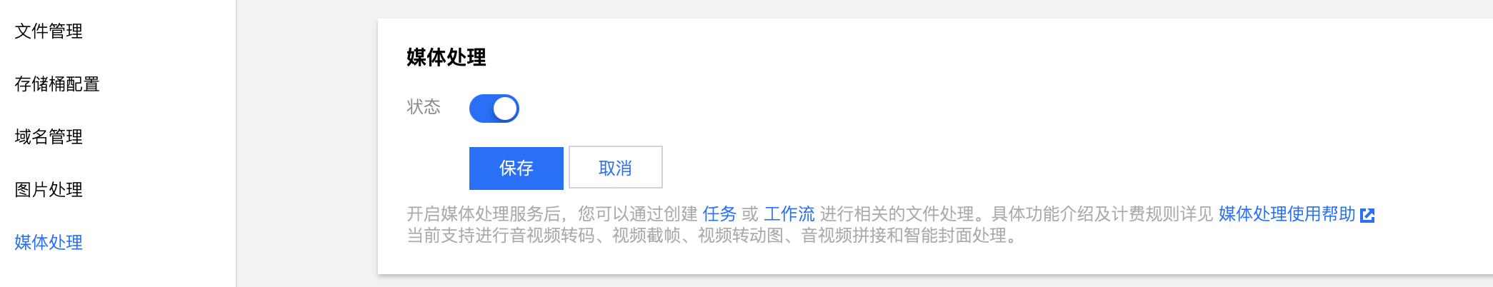 4. 在左侧导航栏中,单击媒体处理,单击编辑将状态修改为“开启”,单击保存。
