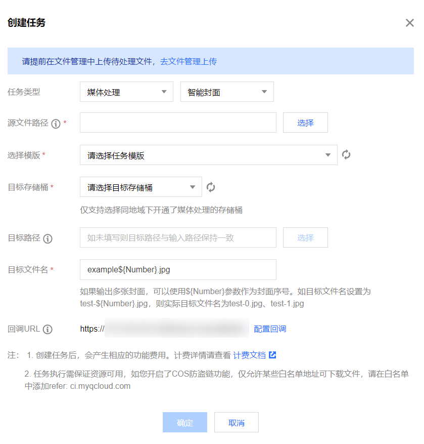 5. 功能类别选择智能编辑,任务类型选择智能封面 ,单击创建任务,按照如下配置项说明配置后,单击确定。
