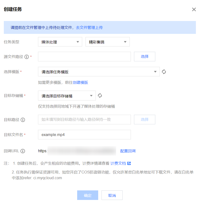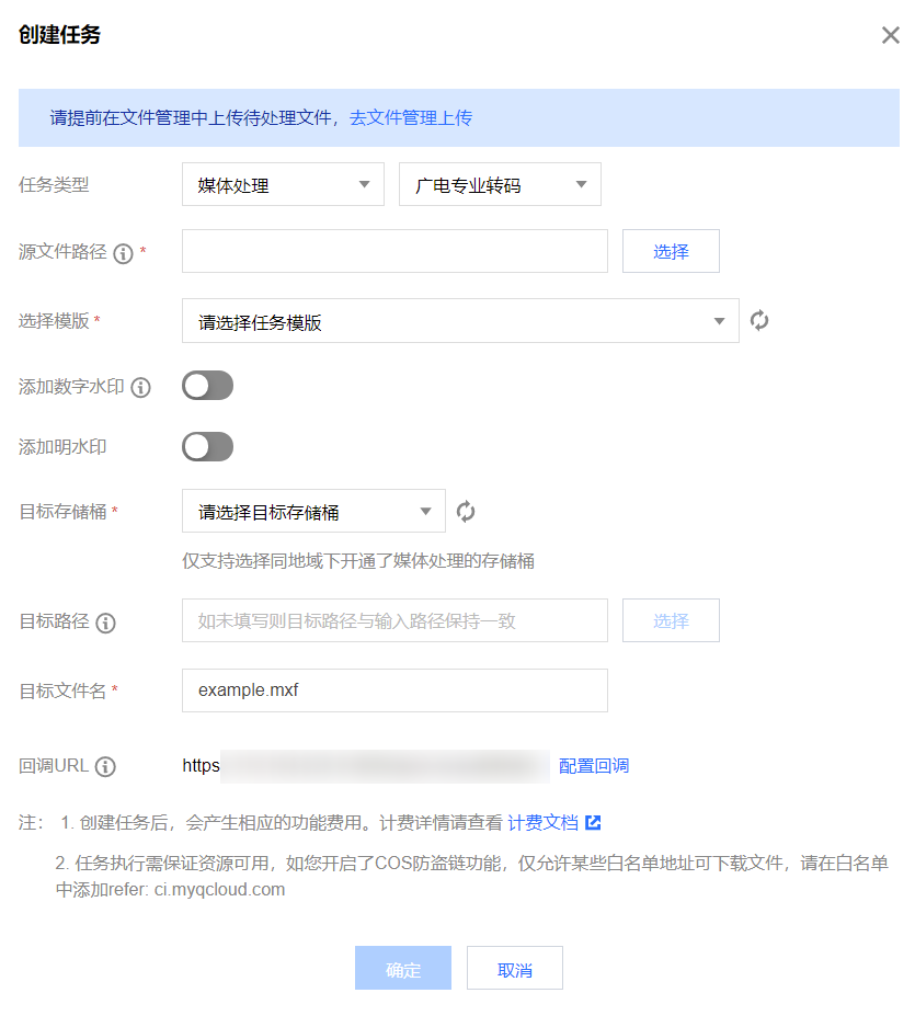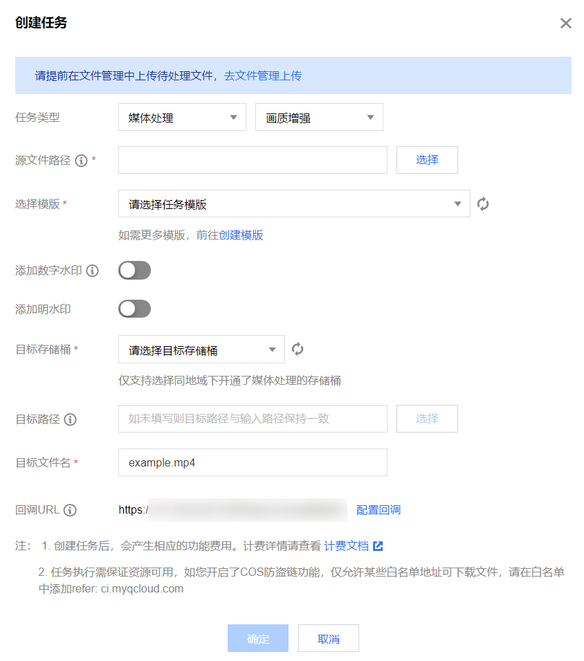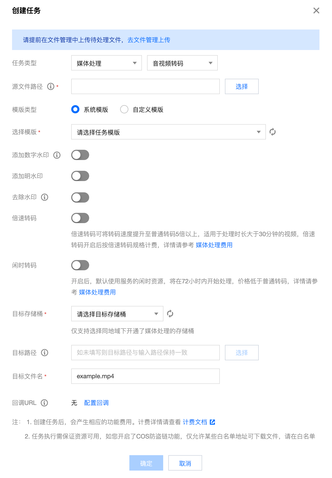 目标存储桶:支持选择同地域下开通了媒体处理功能的存储桶。