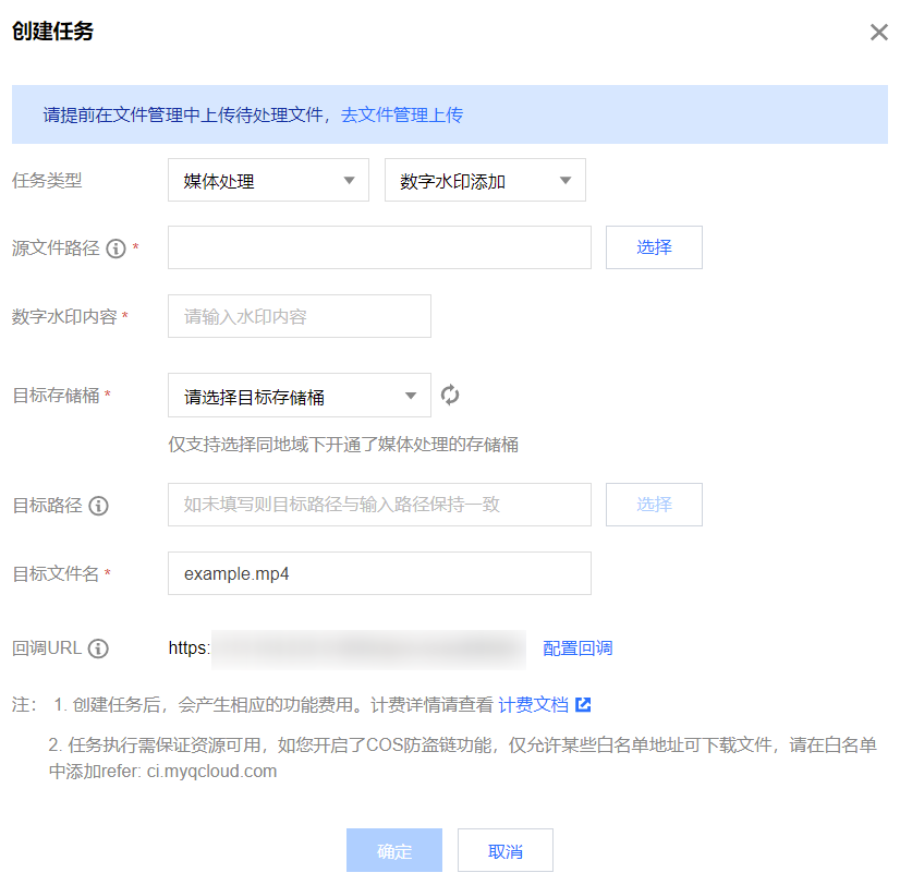 5. 功能类别选择版权保护,任务类型选择数字水印添加,单击创建任务,按照如下配置项说明配置后,单击确定。