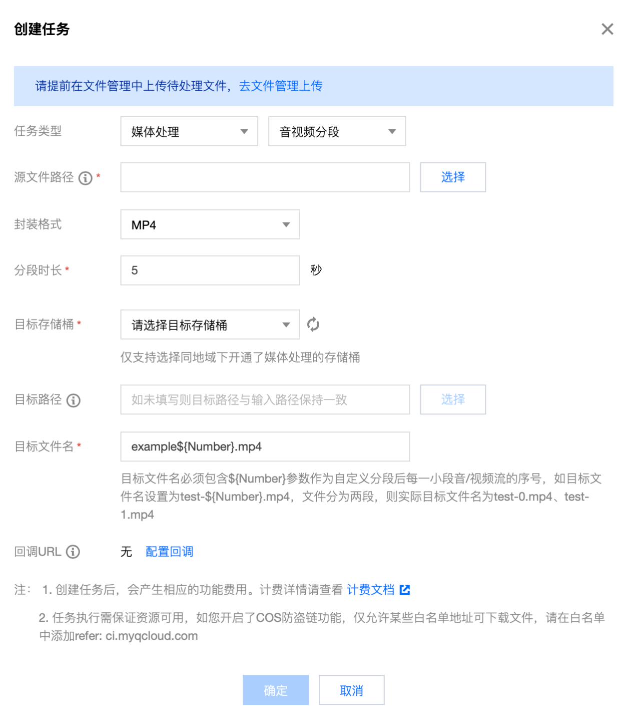 5. 功能类别选择转码处理,任务类型选择音视频分段 ,单击创建任务,按照如下配置项说明配置后,单击确定。