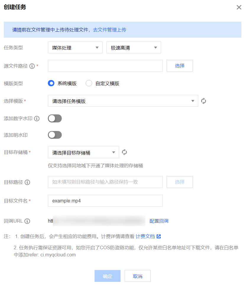 5. 功能类别选择转码处理,任务类型选择极速高清 ,单击创建任务,按照如下配置项说明配置后,单击确定。