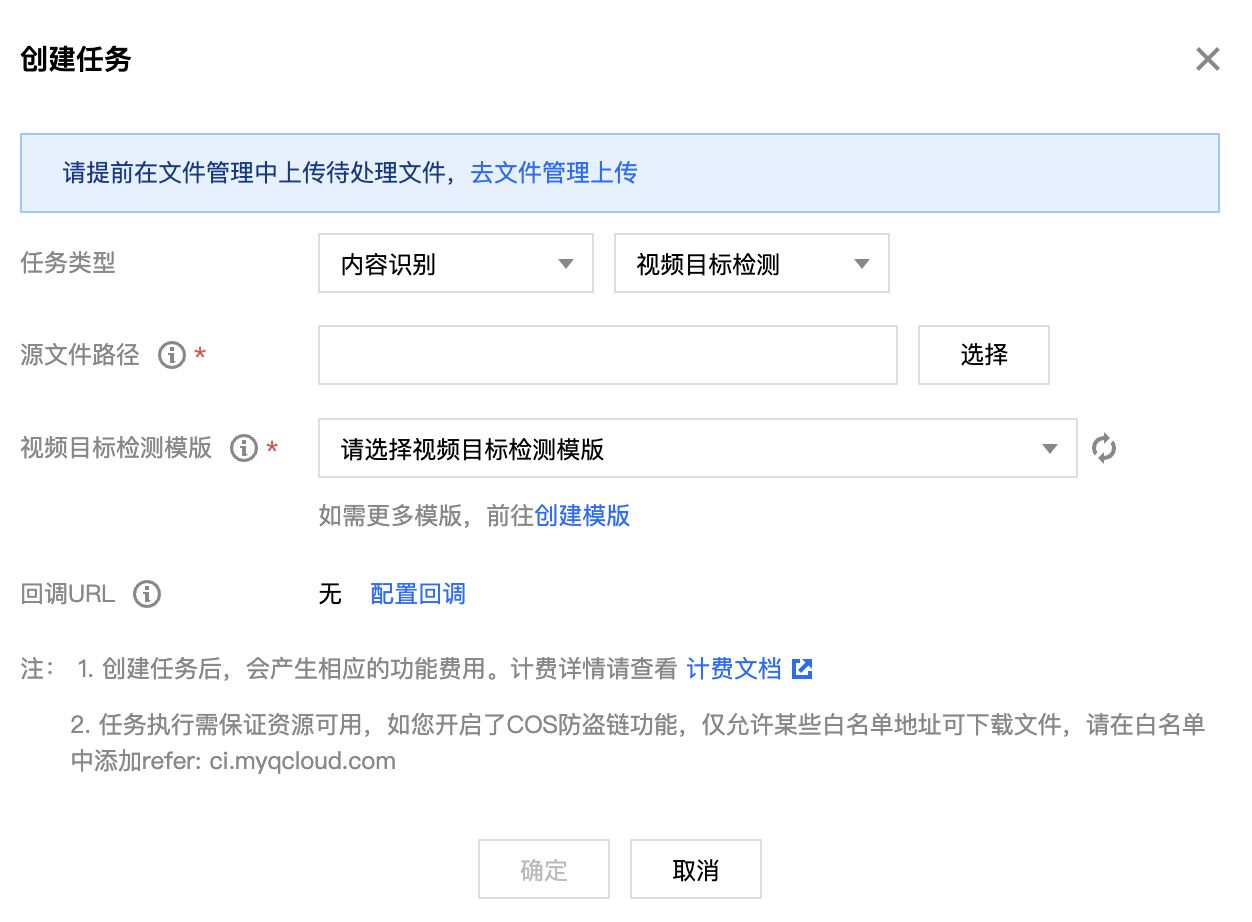 回调 URL:与队列绑定的回调地址信息,详情请参见 队列与回调。 视频目标检测