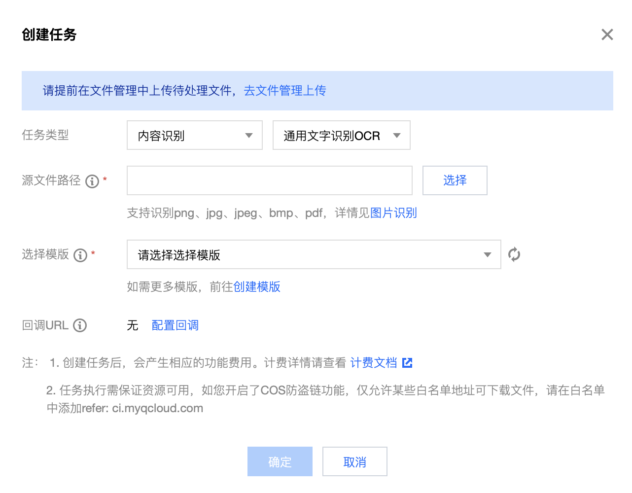 5. 任务类型选择通用文字识别OCR,单击创建任务,按照如下配置项说明配置后,单击确定。