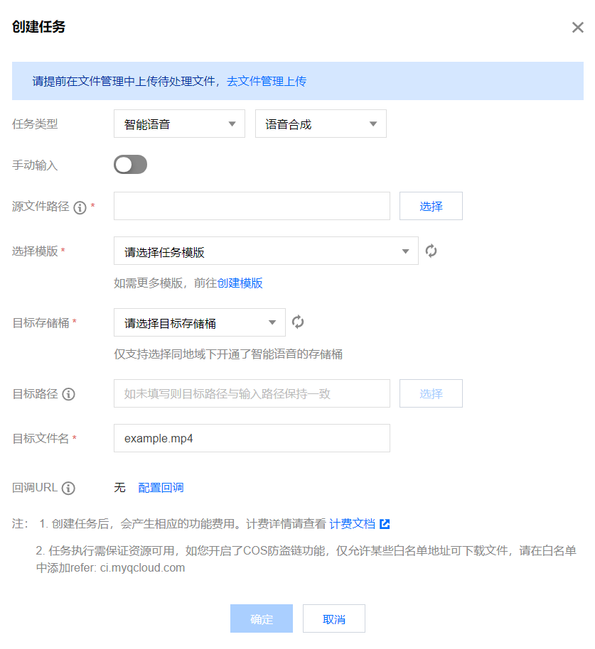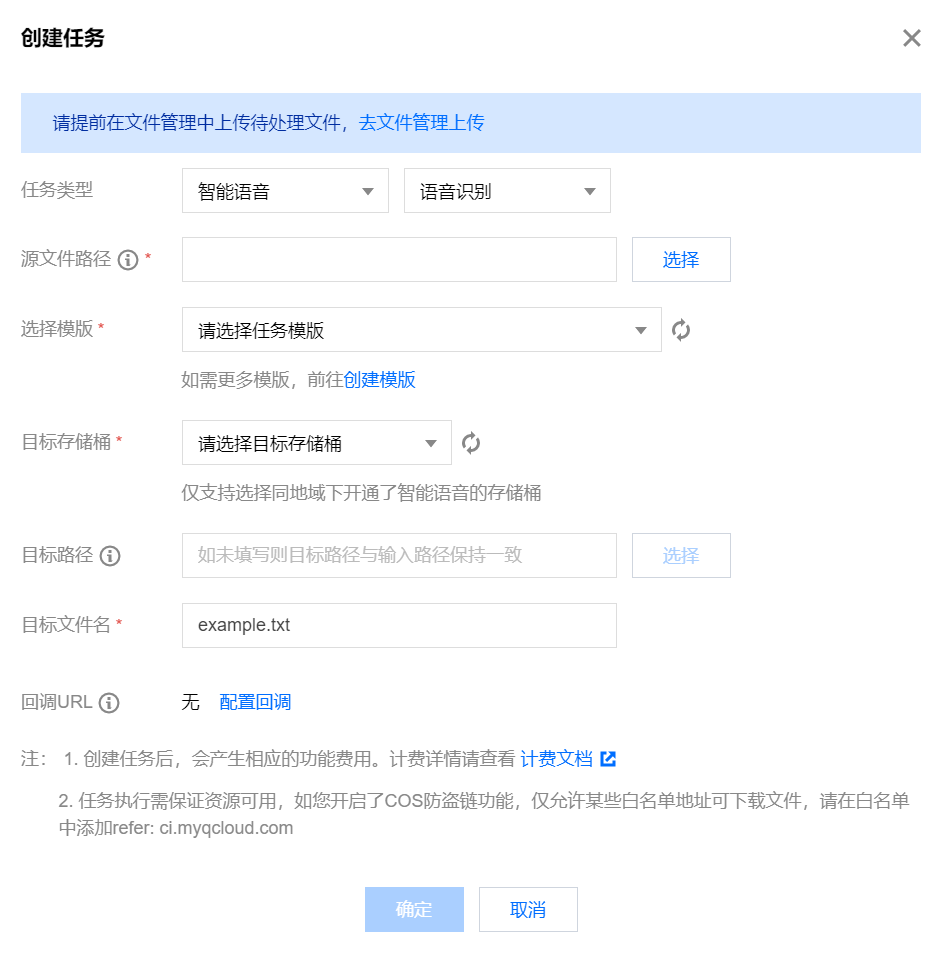目标存储桶:支持选择同地域下开通了智能语音功能的存储桶。