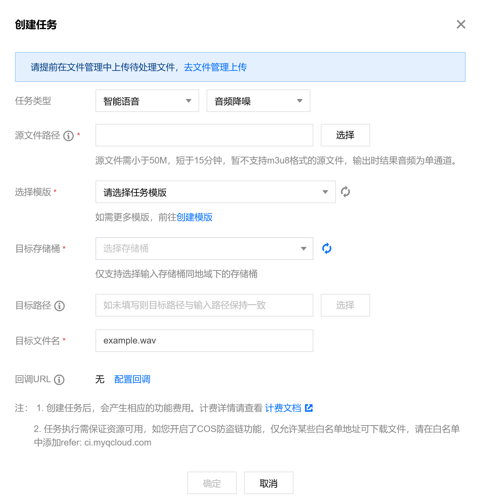 5. 任务类型选择音频降噪,单击创建任务,按照如下配置项说明配置后,单击确定。