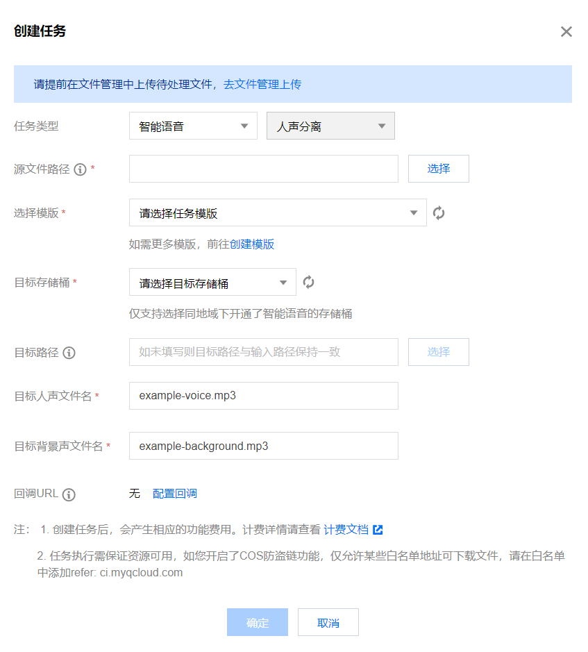 目前任务功能仅能对存量文件进行操作,若您需要在上传时对文件进行操作,请使用 工作流 功能。 使用智能语音服务时,请先确认相关限制条件与地域,详情请参见 使用限制。 人声分离