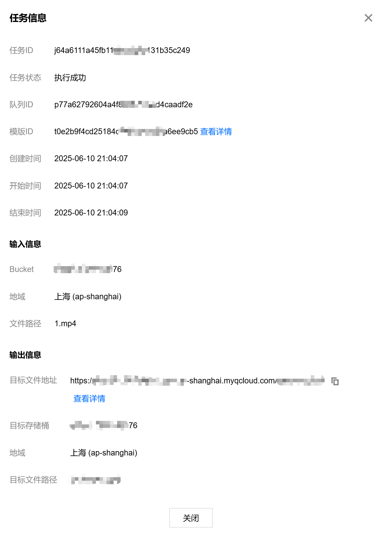 7. 单击任务 ID或任务右侧的查看,可查看任务的以下信息。