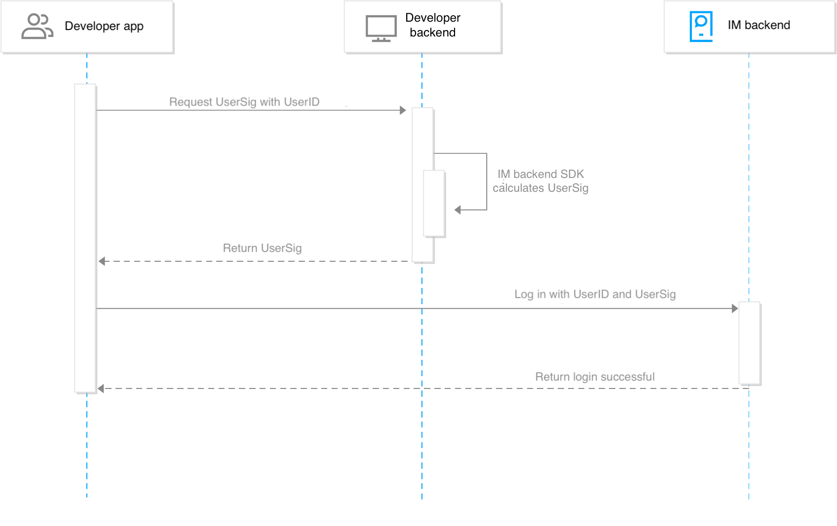 UserSig:用户登录即时通信 Chat 时使用的密码,其本质是 App Server 用密钥对 UserID 等信息加密后的数据。具体生成方法请参见 生成 UserSig。 App 登录流程