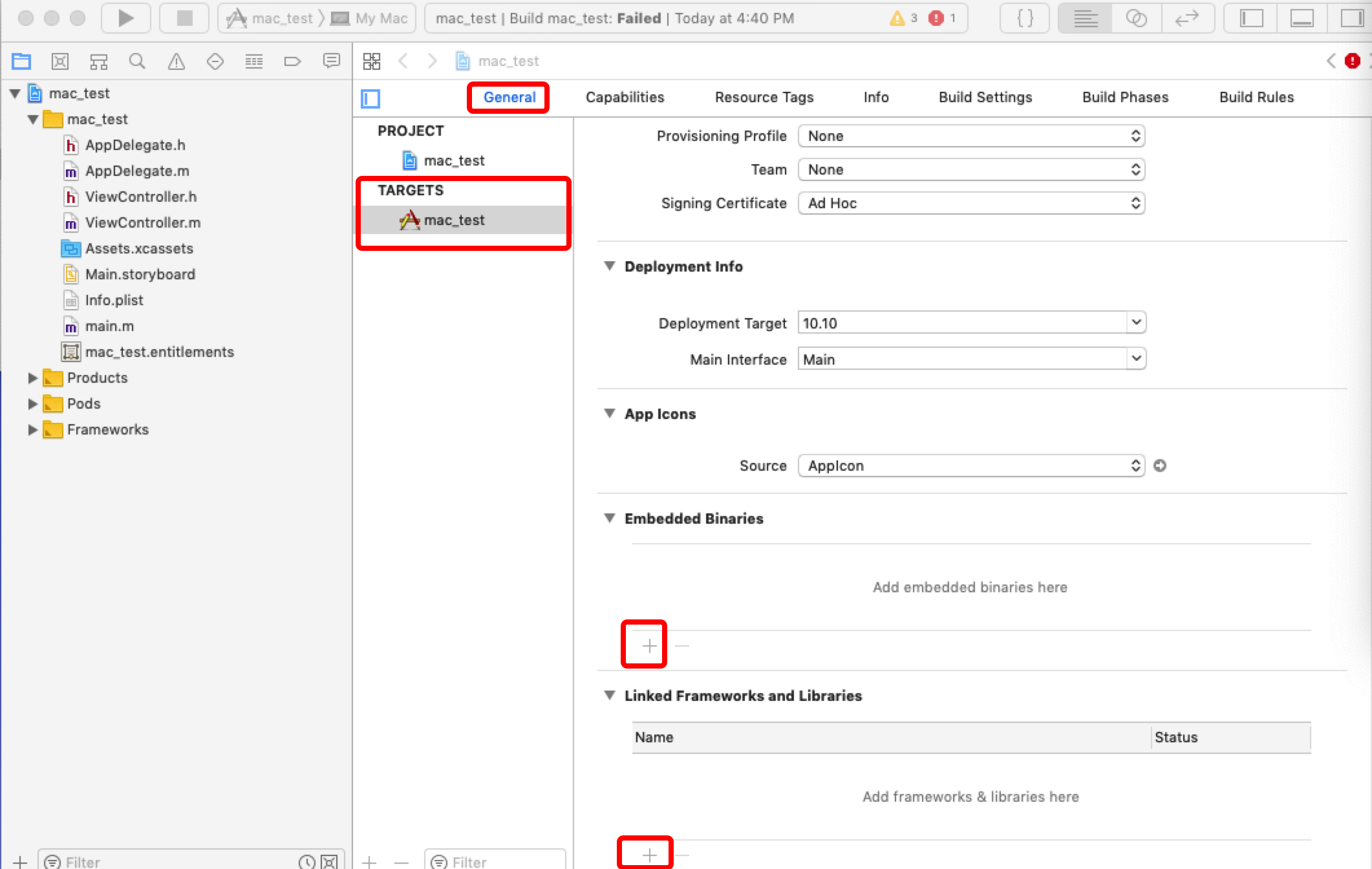 添加依赖库:选中 Demo 的Target,在General面板中的 Embedded Binaries和Linked Frameworks and Libraries添加依赖库。