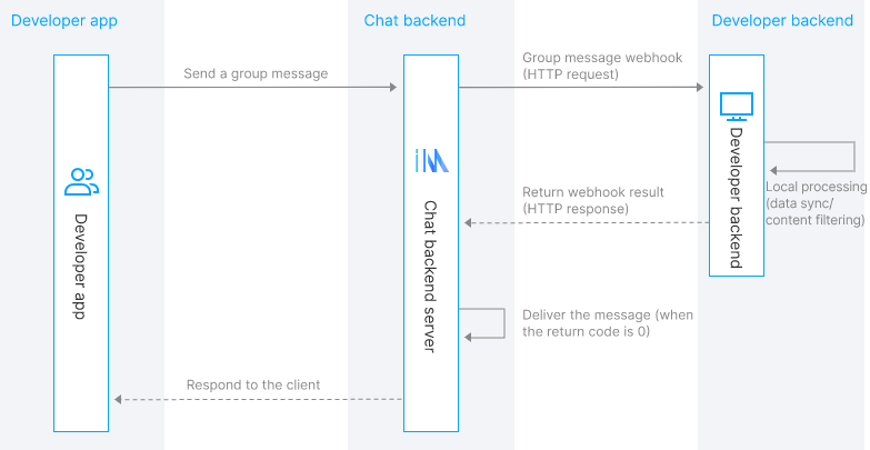 回调 URL 访问超时 | 1. 即时通信 Chat 无法完成 DNS 解析,请确认该域名是否在公网生效。(例如,回调 HOST 为 http://notexist.com,该域名不存在,即时通信 Chat 无法完成 DNS 解析。) 2. 即时通信 Chat 无法访问到回调 URL 中配置的 IP,请确认该 IP 是否公网可达。(例如,回调 HOST 为 http://10.0.0.1,该域名为 App 内网 IP,即时通信 Chat 无法访问到该 IP。) 3. App 回调服务防火墙策略限制,请检查防火墙配置。(例如,App 回调服务器拒绝了所有到达 80 端口的请求。) |