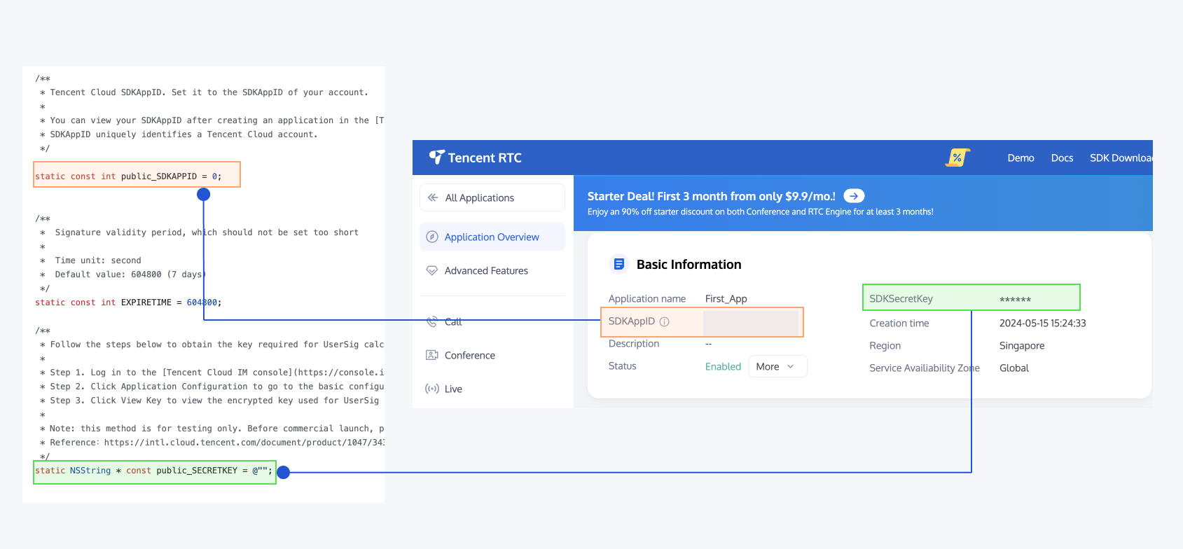 SDKAppID、SDKSecretKey,后续运行 Demo 时需要用到这两个信息。