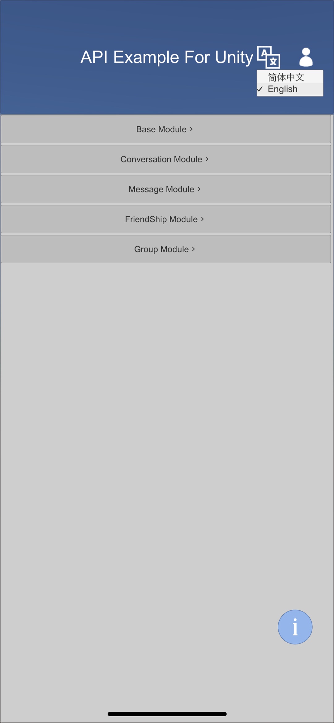 IM_Api_Example/Assets 下的 Main Scene 来启动 Demo,您可以在这里选择语言。